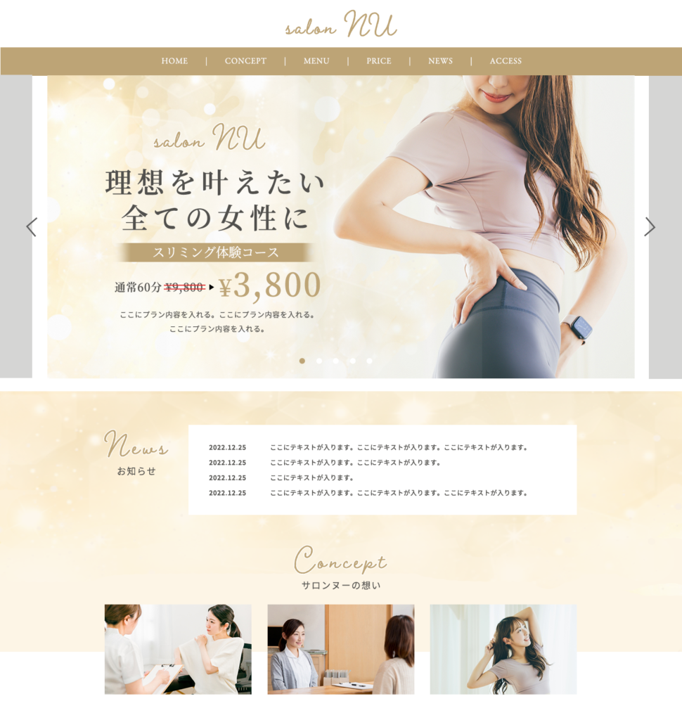 女性受けとエステのイメージでゴールドを使いました。痩せた自分を想像させたかったので綺麗な体のラインの女性を選びました。