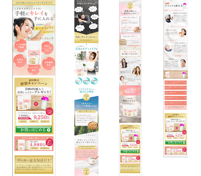 女性向けの商品なので女性らしいけど可愛すぎず商品の魅力が伝わる構成にしました。目線が下に下に行くよう所々に矢印をつけたりと同線を意識しました。